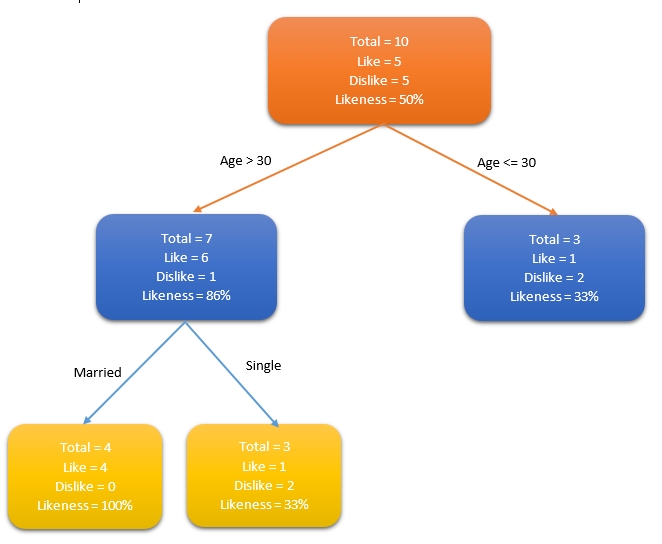 简单决策树算法案例,确定人群中谁喜欢使用信用卡。考虑人群的年龄和婚姻状况,如果年龄在30岁或是已婚,人们更倾向于选择信用卡,反之则更少。 通过确定合适的属性来定义更多的类别,可以进一步扩展此决策树。在这个例子中,如果一个人结婚了,他超过30岁,他们更有可能拥有信用卡(100% 偏好)。测试数据用于生成决策树。
