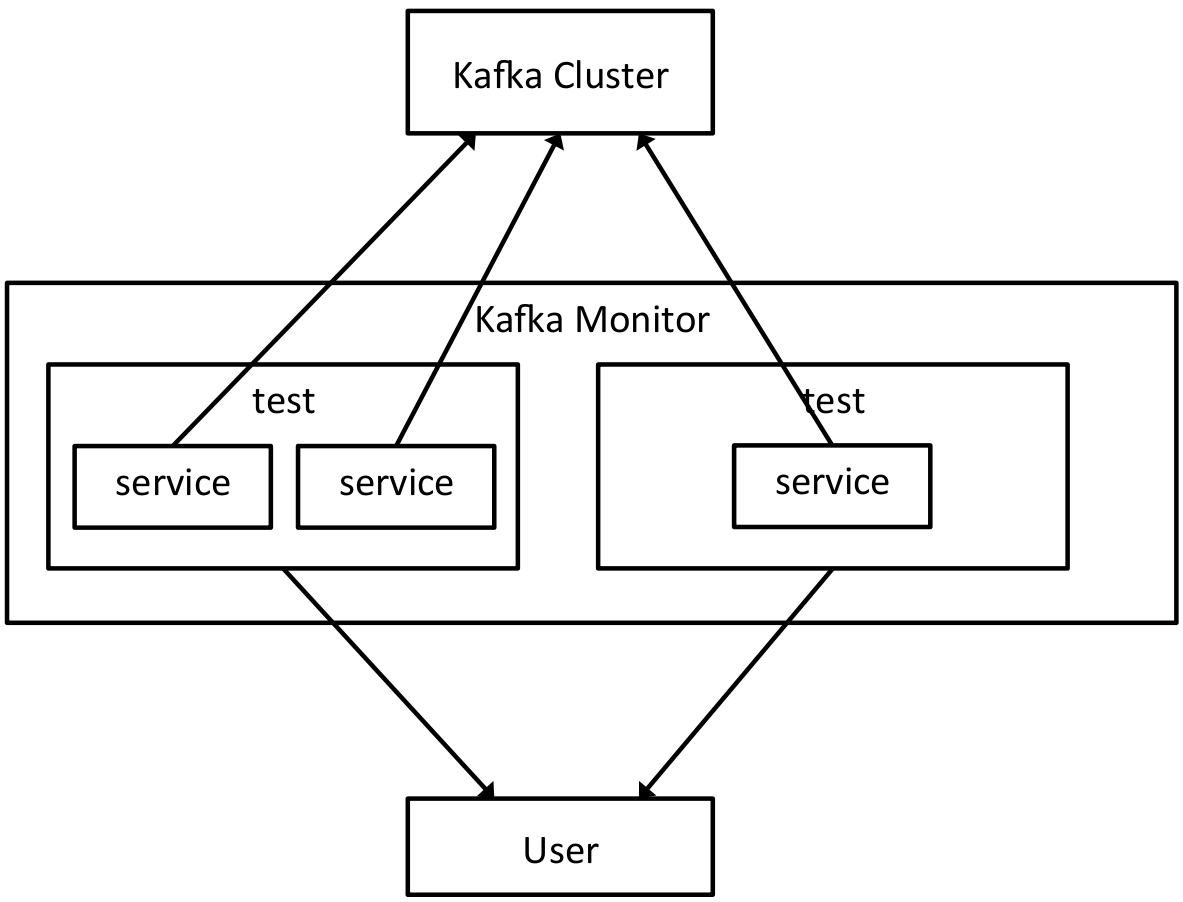 一个Kafka Monitor 实例运行在一个单独的Java进程,在相同的进程里可以再产生多个测试用例和服务。下面的示意图表达了服务,测试用例和Kafka Monitor实例之间的关系,也可以知道Kafka Monitor 如何在Kafka集群和用户之间相互作用。