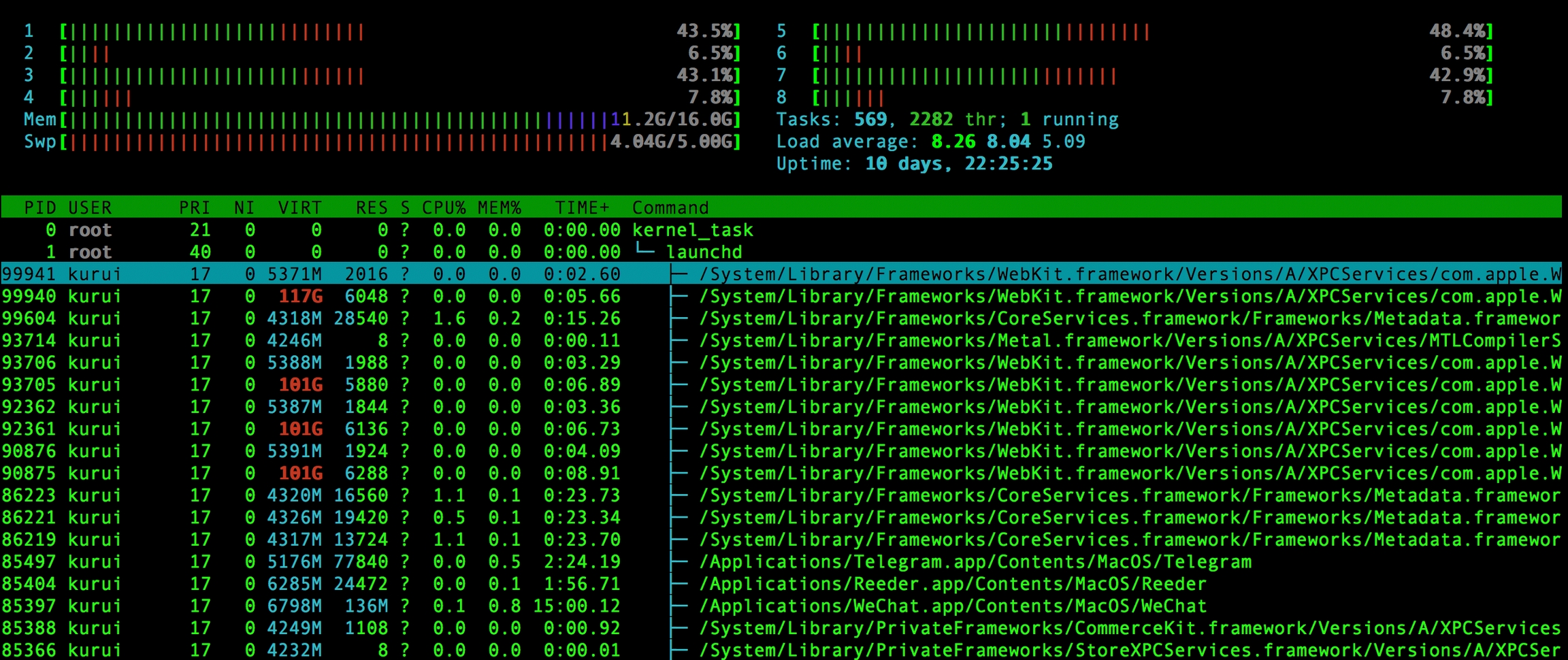 top 是一个快速诊断系统性能的工具。值得一提的是 top for Mac 与 Linux 上的输出不太一样。htop 优化了顶部输出格式,并支持大量的颜色, 键盘快键键和视图, 帮助我们洞察进程行为。更多信息:http://hisham.hm/htop/