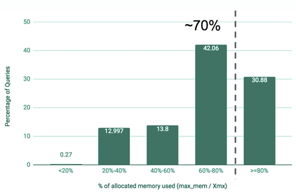 Uber 还将 JVM Profiler 应用到了所有 Hive on Spark 应用, 并发现了一些提高内存使用效率的机会。下面的图3显示了 Uber 发现的一个结果: 大约70% 的应用程序的实际内存利用率不到已分配内存的 80% 。研究结果表明, 大多数应用程序可以分配较少的内存并将内存利用率提高 20% 。