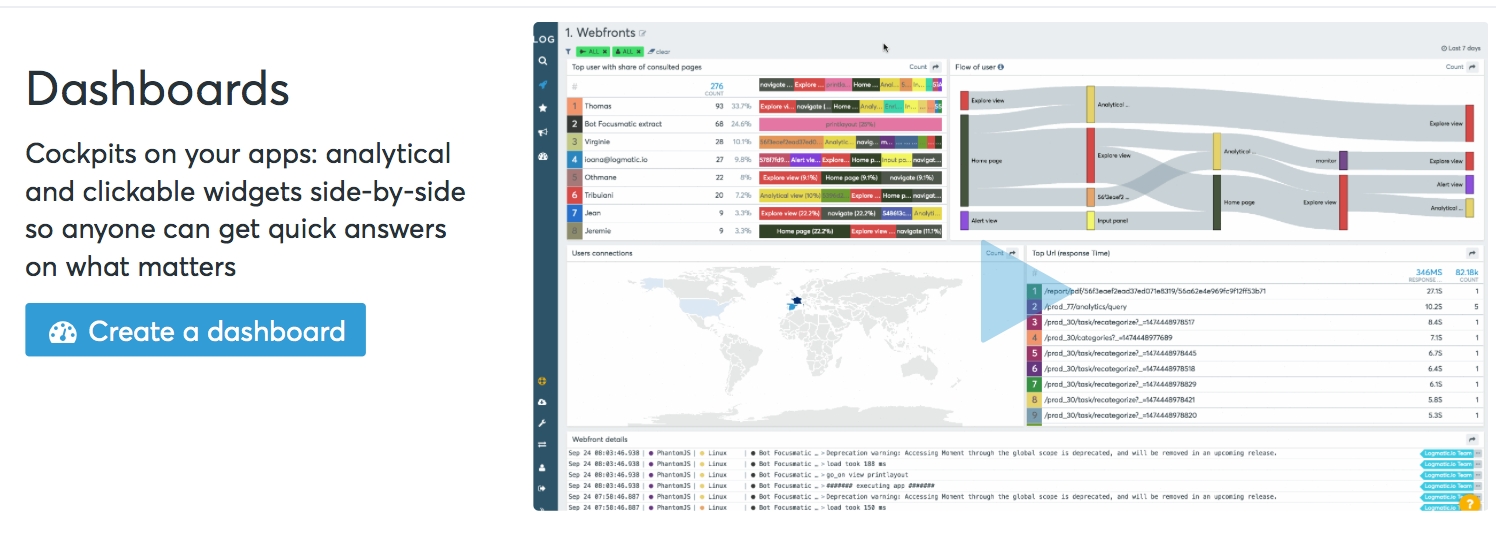 在真实场景中日志数据体量非常庞大,日志存储只是第一步,更多的情况是需要查看特定指标或者能够快速检索信息,此时日志分析平台就发挥作用了。以logmatic为例,可以在它的官网注册https://logmatic.io/,免费体验。