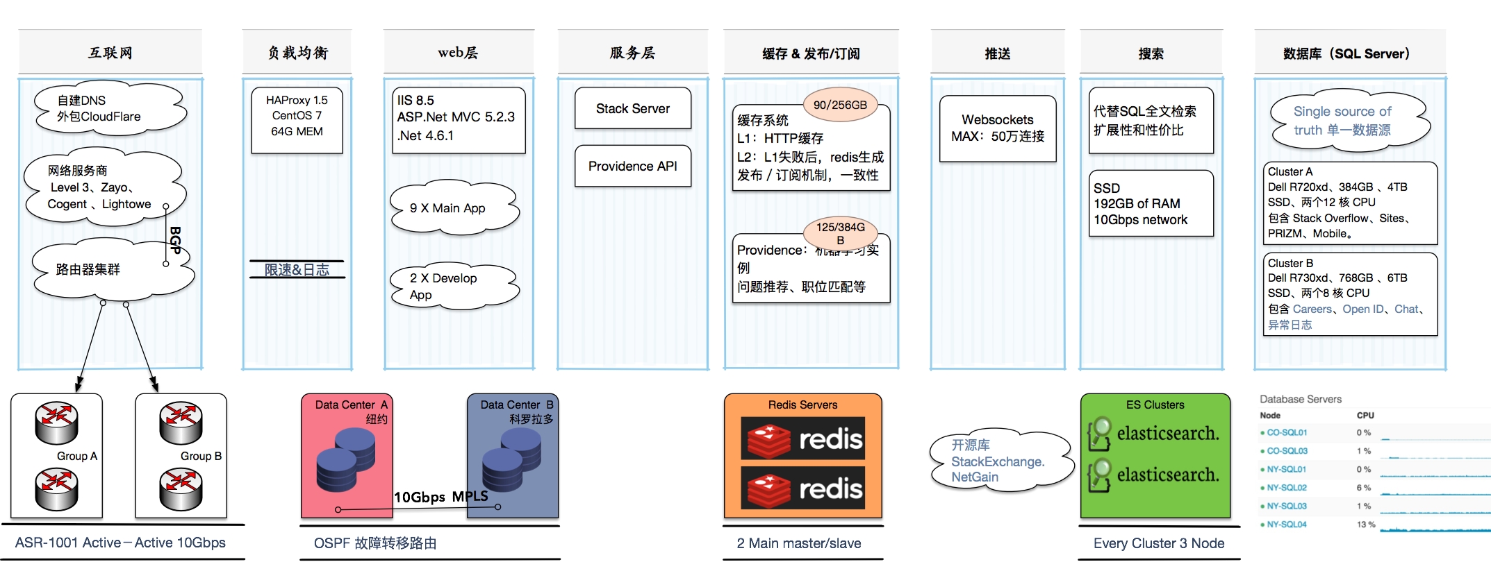 我曾今反复重申过多次:性能是一个重要组件。 特别是当你的代码必须在最快的硬件上运行,硬件的关系则越为重大。正如任何其它的平台,Stack Overflow的架构是分层的。硬件对我们来说属于基础层,它有自己的屋子,在很多情况下,对我们来说,它的许多关键组件是不可控的。。。就像运行在别人的服务器。它也伴随着直接和间接的成本。但是,这些不是本篇文章的重点,这方面的对比将于稍后报告。目前来说,我希望能提供一份详细的,关于我们基础设施的清单,用于大家参考和比较。